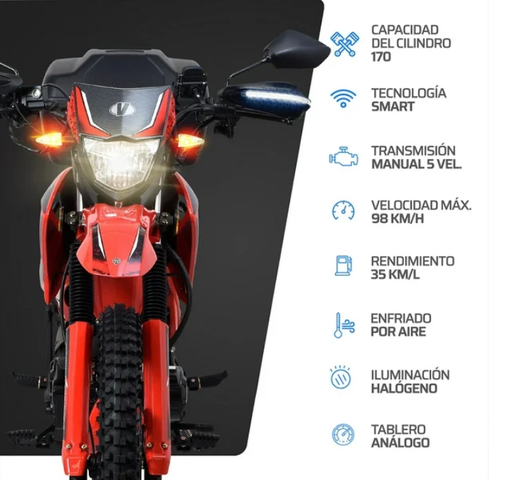 Con su motor de 170 enfriado por aire, transmisión manual de 5 velocidades, velocidad máxima de 98 Km/H y una potencia de 15 HP, esta máquina doble propósito te llevará a nuevas alturas en el mundo de dos ruedas.