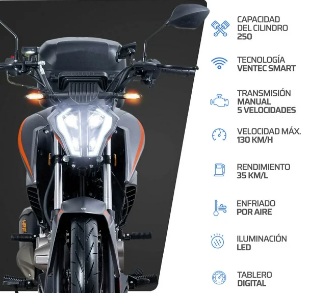 Deja que su cilindrada de 250 cc te lleve por la ciudad con su motor de 4 tiempos enfriado por aire y 18 HP de potencia, con la que puedes alcanzar hasta 130 km/h.