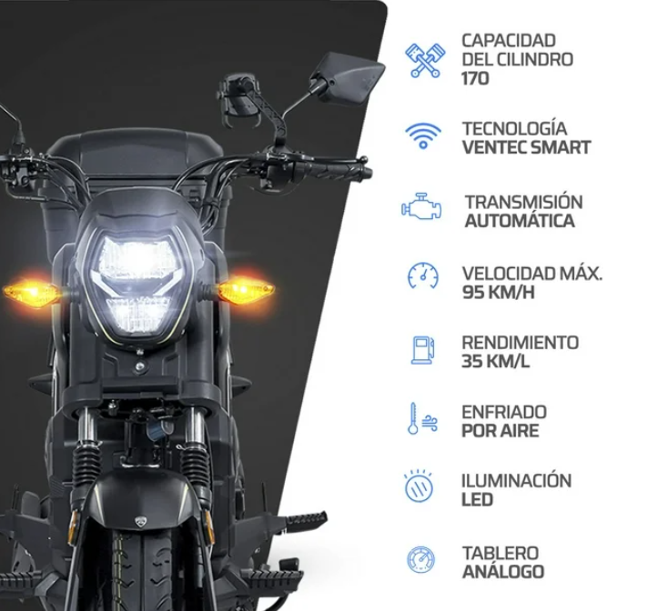 OVNI 170 Experimenta una nueva forma de moverte y viaja con estilo con la nueva motocicleta Vento modelo OVNI 170 2025. Con un diseño al estilo Crossover, que fusiona características estéticas de una motocicleta con los beneficios de manejo de una motoneta por su capacidad de cilindro de 170, enfriado por aire y transmisión automática, lo que la transforma en una excelente opción de manejo ágil y muy ligera. Cuenta con una capacidad de combustible de 4.5 litros y un rendimiento de 35 Km/L. Posee frenos de tambor y rines de acero prensado que te brinda un mejor control, mientras que su suspensión trasera de amortiguador con resorte te otorga una mayor firmeza en lugares inestables. Logra una velocidad máxima de hasta 95 Km/H y alcanza una potencia de 10 HP, perfecta para recorrer la ciudad. Además, la incorporación de la tecnología VenTec, te permitirá enlazar la moto con tu smartphone para subir o bajar el volumen de tus canciones favoritas, adelantar o regresar canciones y contestar o declinar llamadas.