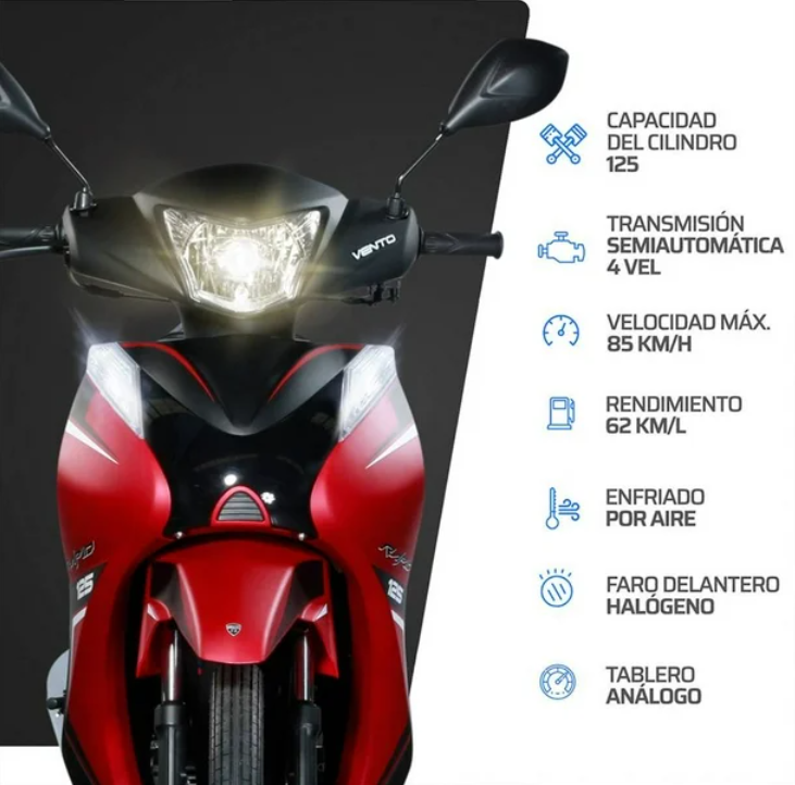 Por su ligereza y maniobrabilidad, este vehículo te permite desplazarte con plena facilidad por la ciudad. Disfruta de la potencia y comodidad que te ofrece la motocicleta Vento modelo Rapid 125 2025. Se distingue por tener un motor de 4 tiempos y enfriado por aire, el cual te ofrece 125 centímetros cúbicos de desplazamiento de pistones. Alcanza una potencia máxima de 10 HP y una velocidad de hasta 85 Km/H.