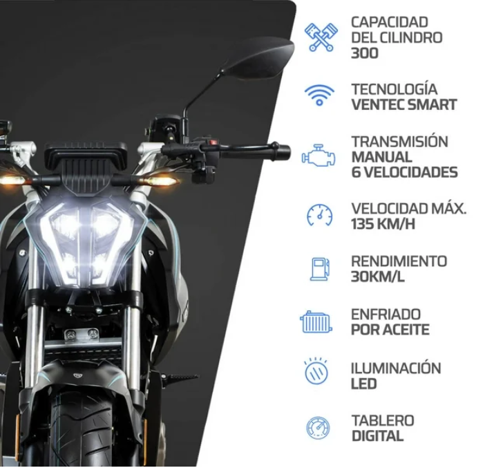 Esta motocicleta 2026 está equipada con un motor de 300 cc, enfriado por aceite y de transmisión manual con 6 velocidades, lo que te brinda una conducción más suave y eficiente.